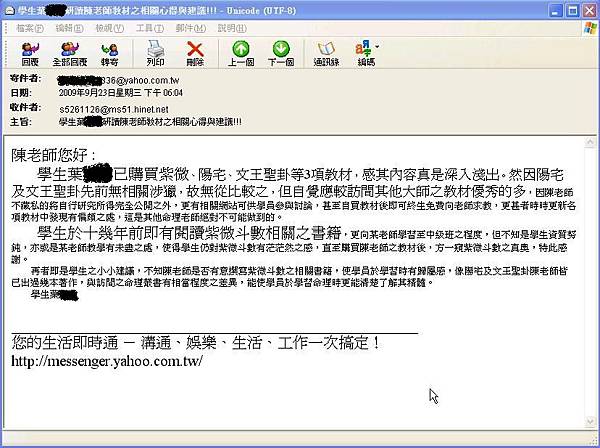 學生葉 已購買紫微、陽宅、文王聖卦等3項教材,感其內容真是深入淺出。然因陽宅及文王聖卦先前無相關涉獵,故無從比較之,但自覺應較訪間其他大師之教材優秀的多,因陳老師不藏私的將自行研究所得完全公開之外,更有相關網站可供學員參與討論,甚至自買教材後即可終生免費向老師求教,更甚者時時更新各項教材中發現有偏頗之處,這是其他命理老師絕對不可能做到的。