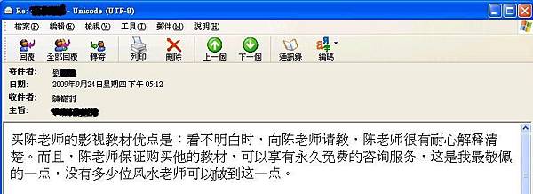 买陈老师的影视教材优点是:看不明白时,向陈老师请教,陈老师很有耐心解释清楚。而且,陈老师保证购买他的教材,可以享有永久免费的咨询服务,这是我最敬佩的一点,没有多少位风水老师可以做到这一点。