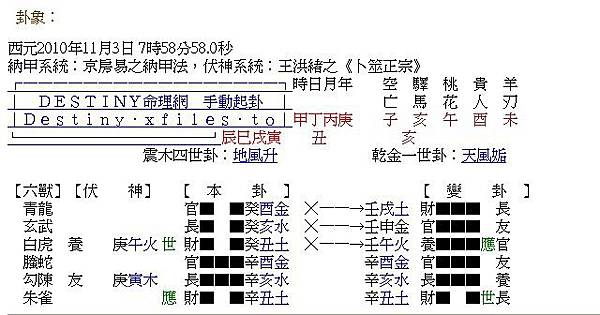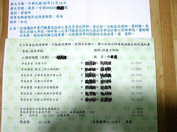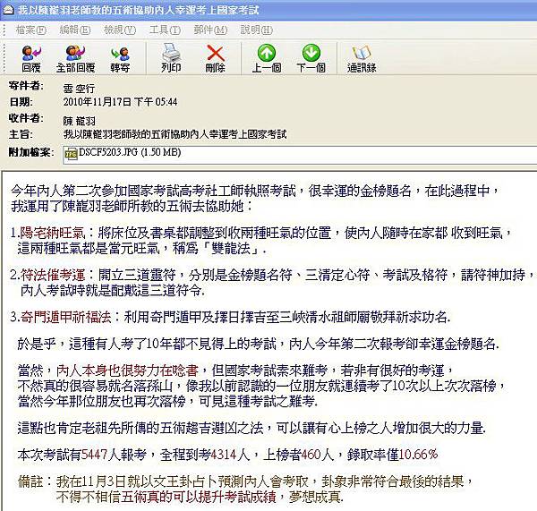 今年內人第二次參加國家考試高考社工師執照考試,很幸運的金榜題名,在此過程中, 我運用了陳巃羽老師所教的五術去協助她: 1.陽宅納旺氣:將床位及書桌都調整到收兩種旺氣的位置,使內人隨時在家都 收到旺氣, 這兩種旺氣都是當元旺氣,稱為「雙龍法」. 2.符法催考運:開立三道靈符,分別是金榜題名符、三清定心符、考試及格符,請符神加持, 內人考試時就是配戴這三道符令. 3.奇門遁甲祈福法:利用奇門遁甲及擇日擇吉至三峽清水祖師廟敬拜祈求功名. 於是乎,這種有人考了10年都不見得上的考試,內人今年第二次報考卻幸運金榜題名. 當然,內人本身也很努力在唸書,但國家考試素來難考,若非有很好的考運, 不然真的很容易就名落孫山,像我以前認識的一位朋友就連續考了10次以上次次落榜, 當然今年那位朋友也再次落榜,可見這種考試之難考. 這點也肯定老祖先所傳的五術趨吉避凶之法,可以讓有心上榜之人增加很大的力量. 本次考試有5447人報考,全程到考4314人,上榜者460人,錄取率僅10.66% 備註:我在11月3日就以文王卦占卜預測內人會考取,卦象非常符合最後的結果, 不得不相信五術真的可以提升考試成績,夢想成真. 卦象:
