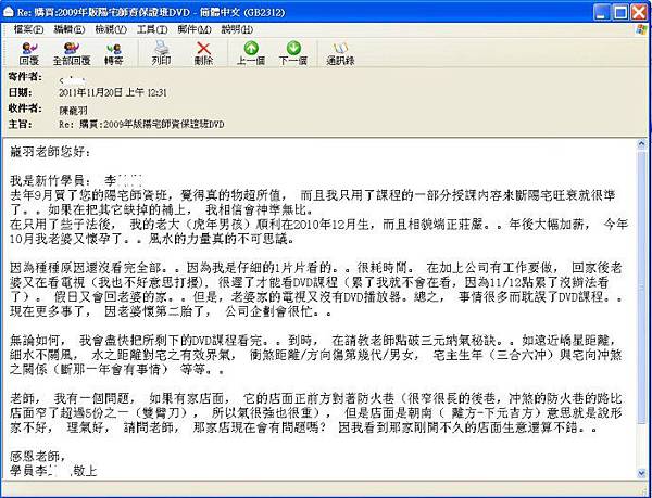 去年9月買了您的陽宅師資班,覺得真的物超所值, 而且我只用了課程的一部分授課內容來斷陽宅旺衰就很準了。。如果在把其它缺掉的補上, 我相信會神準無比。