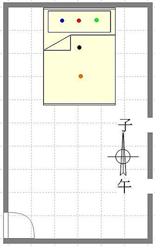 如圖,床中的五個點,藍、紅、綠、黑、橙,每一點的吉凶都不一樣。