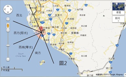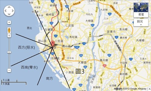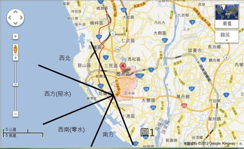 我們先看鳳山的地理位置(如圖1),因為它的範圍較大,我們去靠海比較近的位置當太集點,可以發現西北和南方距水比較遠,沒有受其影響,西方和西南距水比較近,所以受西方(照水)和西南(零水)的影響很大,這正符合本人在2007年陽宅師資班所講的理論(水神真機篇中的零正催照),八運(2004年2月4日至2024年2月3日這20年)的照水需與零水配合,也就是八運時要同時在西南和西方有水,才符合三元納氣的照水。(至於零水和照水的比例秘訣,在此不便公開,也請學員不要回復此秘訣)
