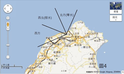 依三元納氣的照水理論,未來的九運(2024年2月4日至2044年2月3日這20年),必須同時收北方和西北的水,所以本人預測9運時,林口、觀音一帶會特別好。(如圖4,用黑線框起來的地區)