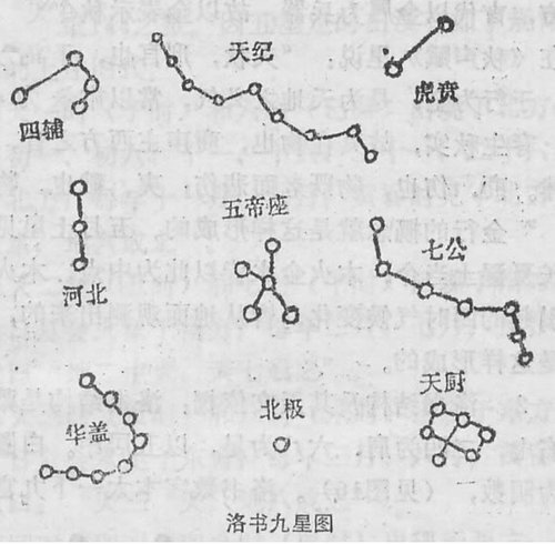 洛書數字本太一下九宮而來,以45數演星斗之象。洛書的實際天象,可參看古代遺傳下來的《洛書九星圖》。《洛書九星圖》是據北斗斗柄所指,從天體中找出九個方位上最明亮的星為標志,便於斗柄在天上辨方定位。從圖中發現九星的方位和數目,即洛書的方位和數目。中宮五星稱‘五帝座’乃北極帝星之座,為五行之首,居中央而臨御四方;‘五帝座’下方為‘北極’一星,恆居北方,以此定位;北極對宮南方是‘天紀’九星;正東方是‘河北’三星;正西面是‘七公’七星;‘天紀’之左是‘四輔’四星;‘天紀’之右是‘虎賁’二星;北極之左是‘華蓋’八星;‘北極’之右是‘天廚’六星。