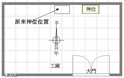 原來的老師把神位安奉在整間工廠的中間靠後面牆壁(如圖1),這樣會有二個缺點: